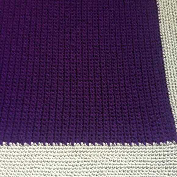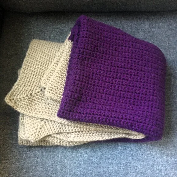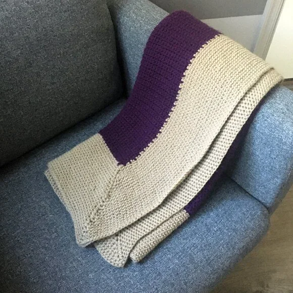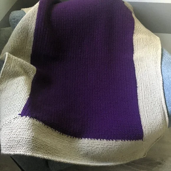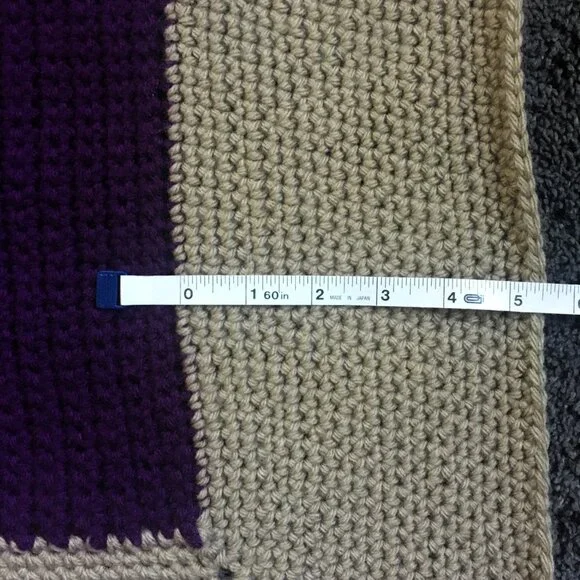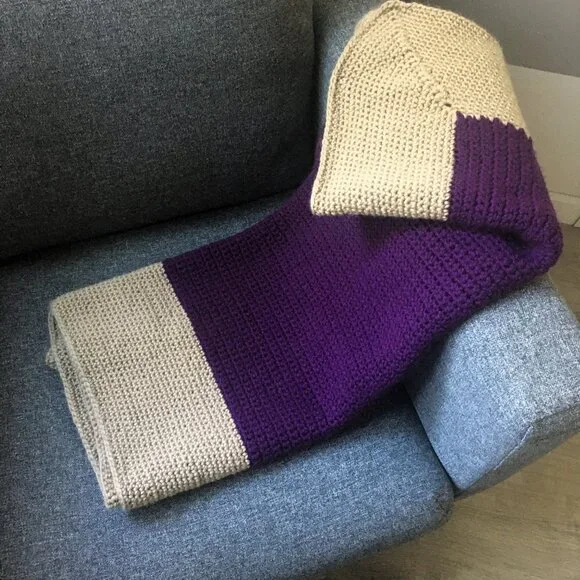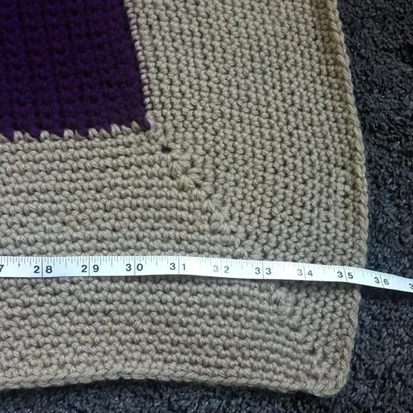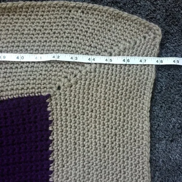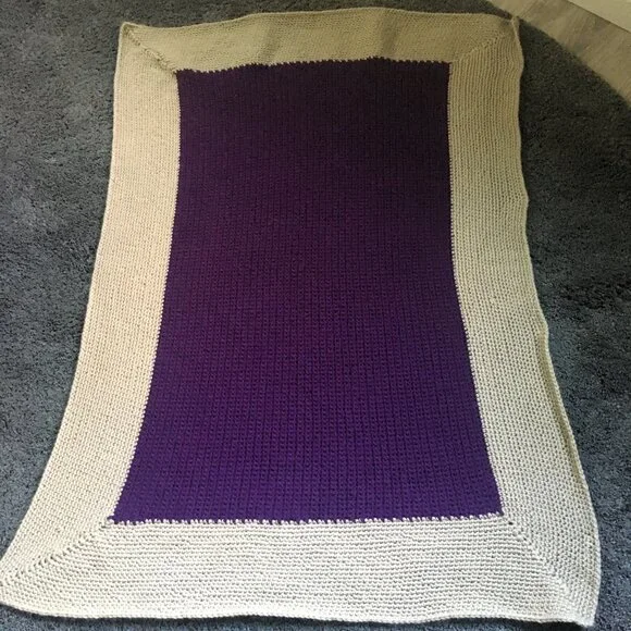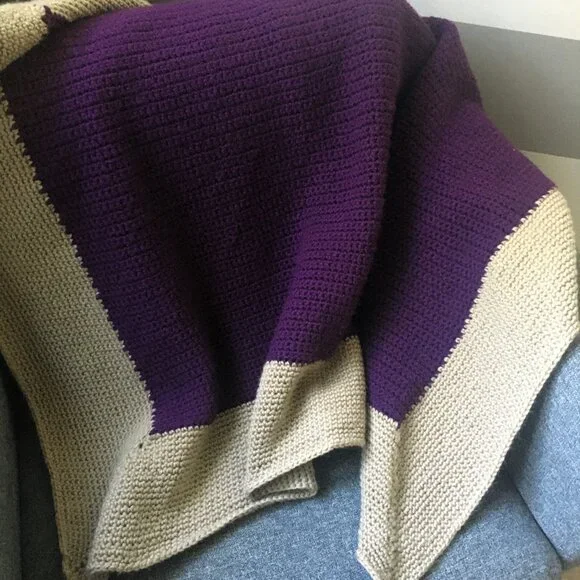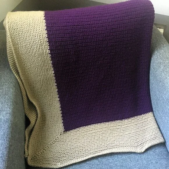 - Rectangular blanket crocheted with two colors and edged with a wide 5 1/2" tan border along all sides- Rich, eggplant purple makes up the center of the blanket in a simple single crochet stitch- Lightweight, soft, and easy to care for. Excellent over a couch or draped over your waist and legs if you just want a little warmth- 100% acrylic- Bold, but with minimalist aesthetics- Machine wash cold and tumble dry on low heat- Handmade, brand new, under the Passeig Artist label and originalMeasurements:- Length: 48”- Width: 35 1/2"