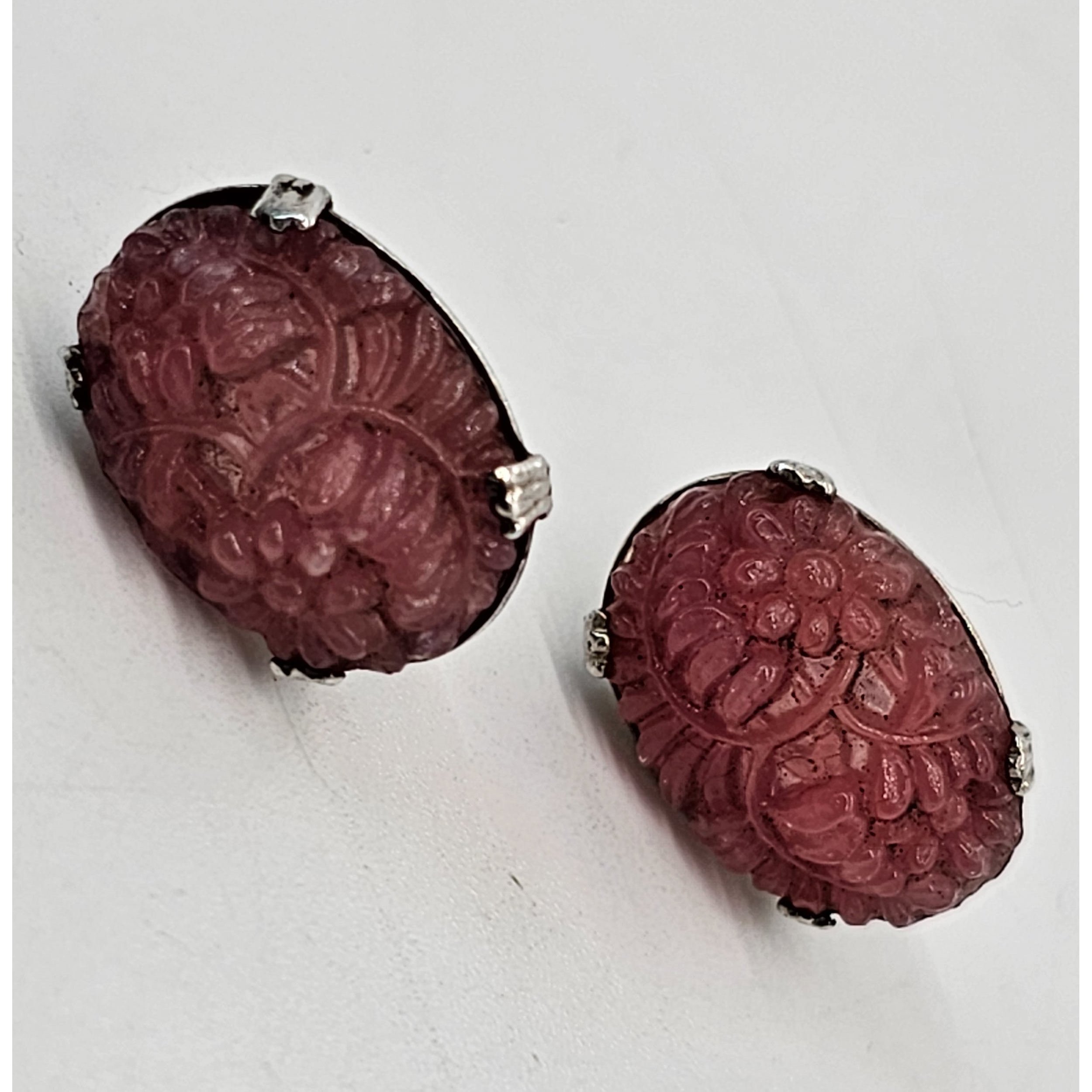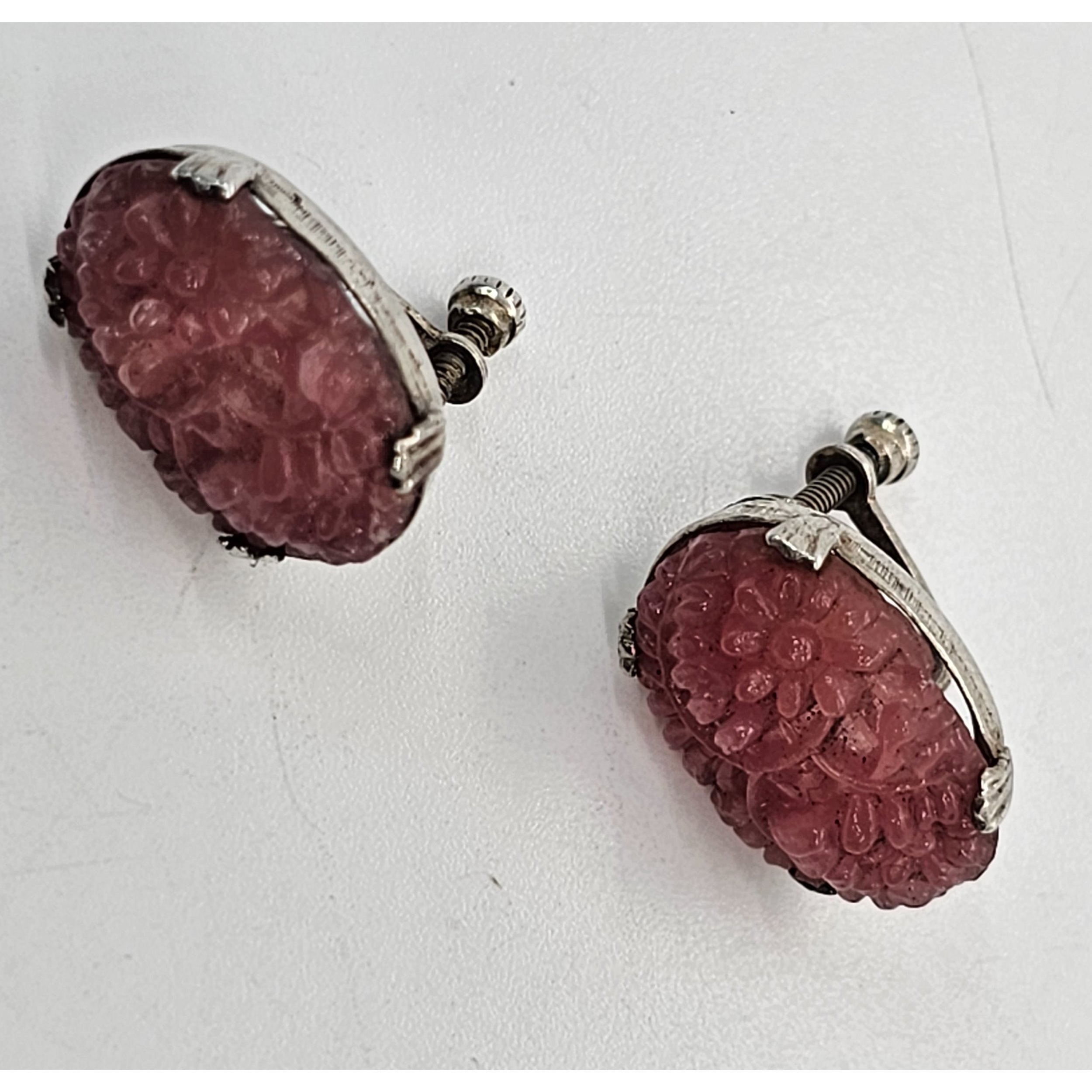 Pink Molded Czech glass vintage screw back sterling silver earrings. Good vintage condition with little signs of normal vintage wear. Prong set pink flower molded glass cabs sit in sterling silver screw back fastening. Stamped sterling on the back of the hammer.